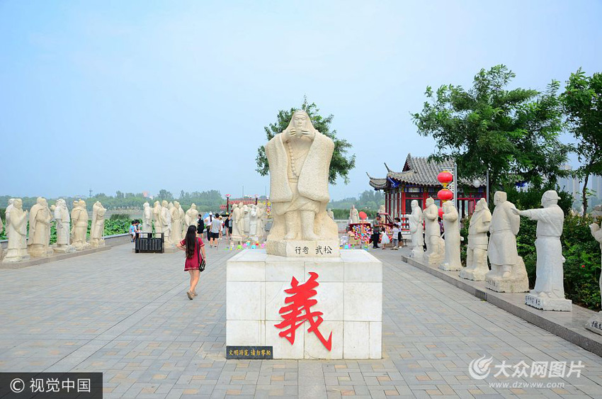 8月22日,聊城市,《水滸傳》108將漢白玉人物雕塑在東昌湖畔驚艷亮相,吸引了眾多游人參觀了解俠義故事。