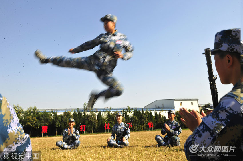 大學生女兵王思孌帶頭向戰友們展示基本功訓練成果。
