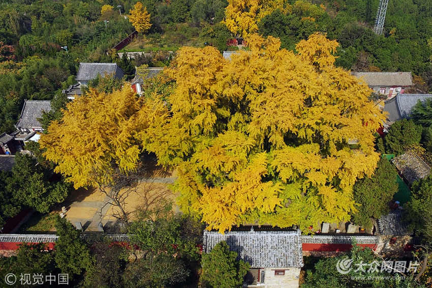 2017年10月31日,山東日照,航拍莒縣浮來山風景區內的“銀杏樹王”。