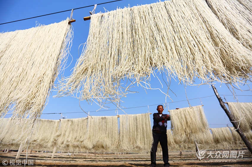 2017年11月2日,山東省棗莊市山亭區蔣溝村農民在加工晾曬地瓜做成的粉條。