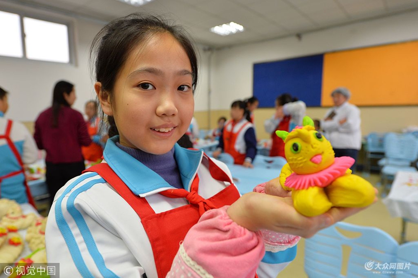 2018年1月23日,青島洛陽(yáng)路一小的學(xué)生展示學(xué)做的面塑老虎。