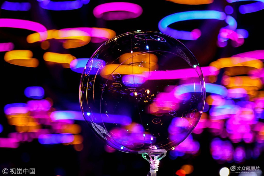 2018年2月17日晚上,青島西海岸新區鳳山路兩旁梧桐樹上安裝的寓意團圓主題的彩色光圈流光溢彩,將狗年正月里的新春夜晚裝點的格外靚麗。