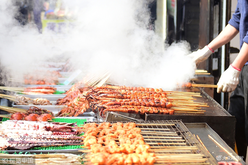 2018年02月26日,山東省青島市。劈柴院的小吃可謂是五花八門,不僅有長沙臭豆腐、老北京爆肚、麻辣小龍蝦這樣的地域美食,還有鐵板魷魚、蒸海膽、煮海星這樣的當地特色,更有小動物造型的奶黃包、鮮果粽子這樣的奇特美食。