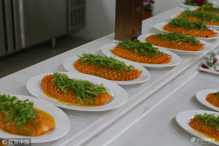 2018年3月3日,在山東日照一家酒店里,一對新人舉辦婚禮大典,698元婚宴20道菜全是素食。圖為令人垂涎欲滴的養眼木瓜菜品。