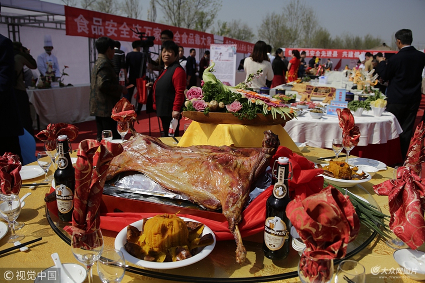 2018年4月9日,山東濱州陽信,梨鄉特色菜品驚艷美食節。獨具特色的陽信烤全羊。