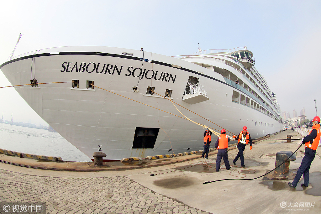 2018年5月6日,在山東煙臺港,碼頭工人為“世鵬旅居者”號靠泊帶纜。圖片作者:唐克/視覺中國