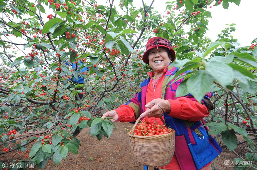 2018年5月11日,一名村民在青島嶗山北宅為游客采摘櫻桃。