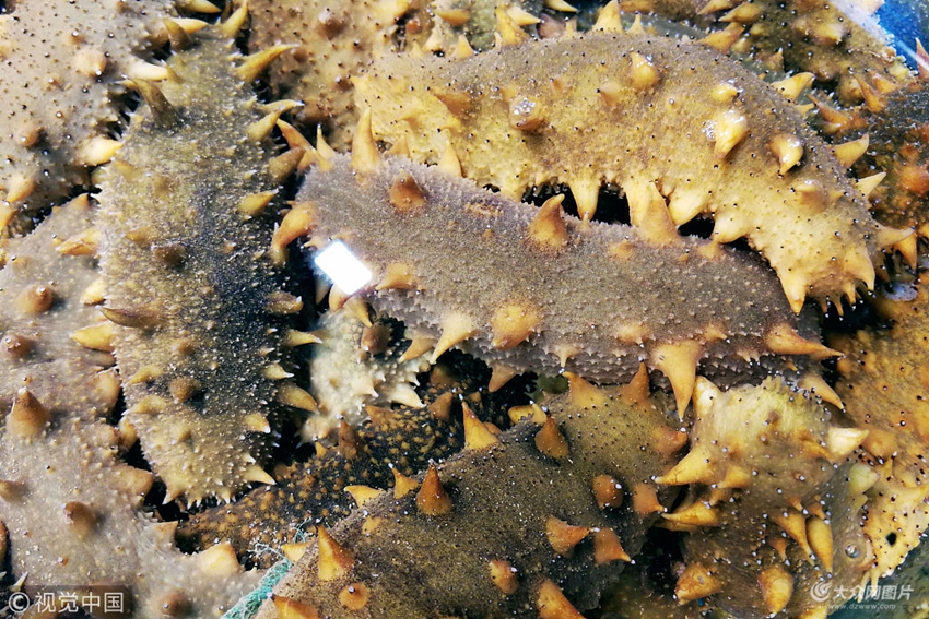 2018年5月14日,山東青島一海鮮市場,放養在海水中的海參。