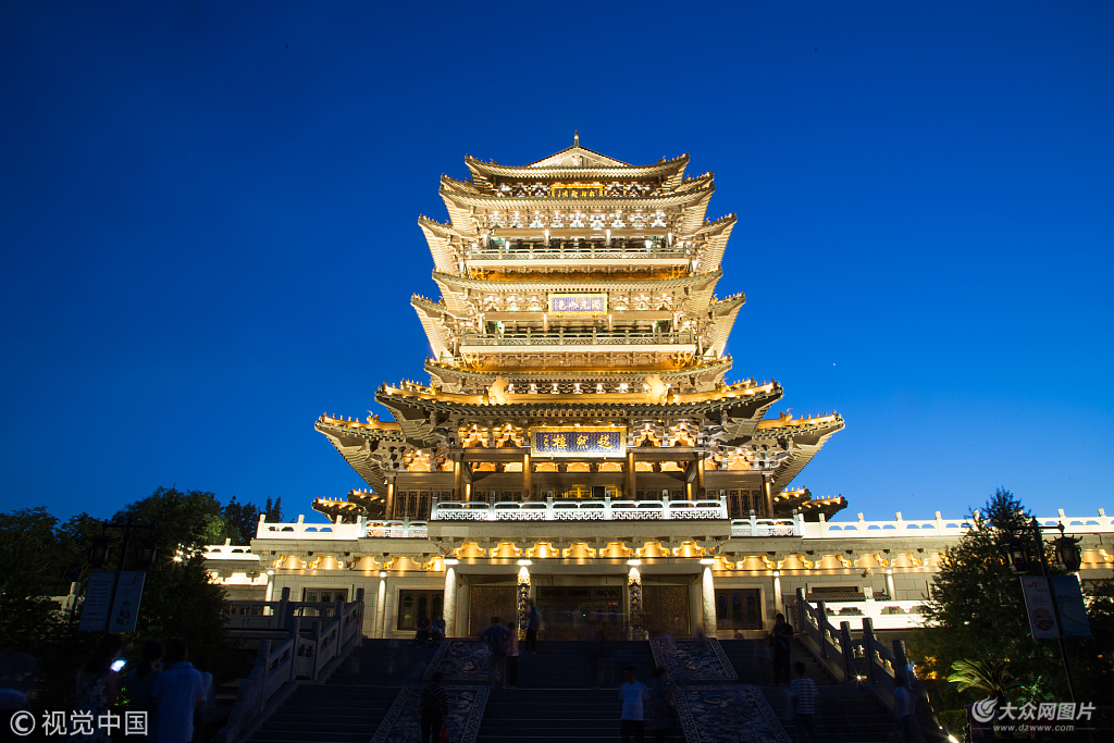 2018年5月24日傍晚,濟南夜幕降臨,超然樓景觀燈亮起,在湛藍色的夜幕下,璀璨奪目分外亮眼。