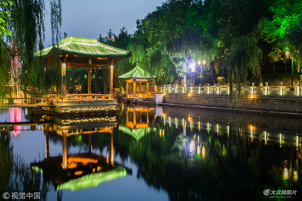 2018年6月7日,夕陽落下后,濟南護城河沿岸的燈光亮起,燈光倒影交相輝映,成一道亮麗風景。圖片作者:聶海石/視覺中國