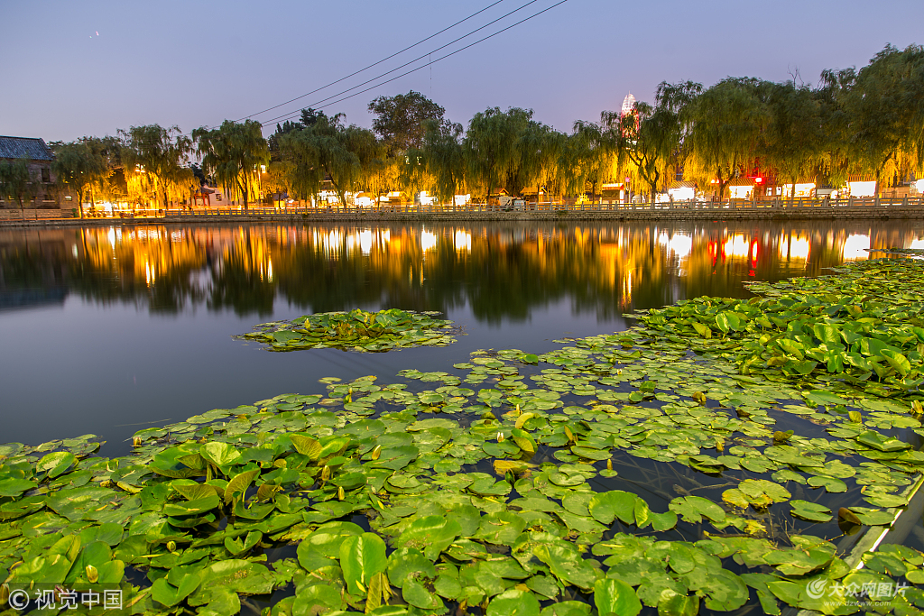 2018年6月11日,濟(jì)南百花洲內(nèi)的荷葉生長(zhǎng)旺盛。夜幕降臨后,百花洲夜景燈光亮起,綠油油的荷葉與夜景燈光相映成趣,璀璨的夜景迷倒眾人。圖片作者:聶海石/視覺中國(guó)