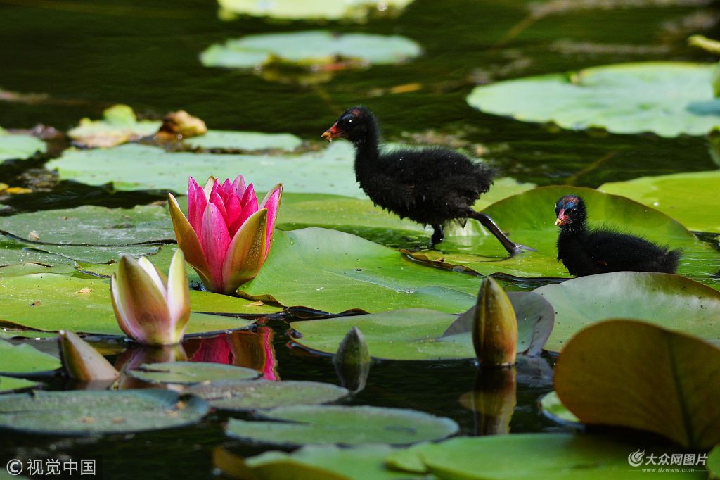 2018年6月11日,剛剛出殼不久的雛鳥在青島中山公園蓮花池中覓食嬉戲。圖片作者:王海濱/視覺中國