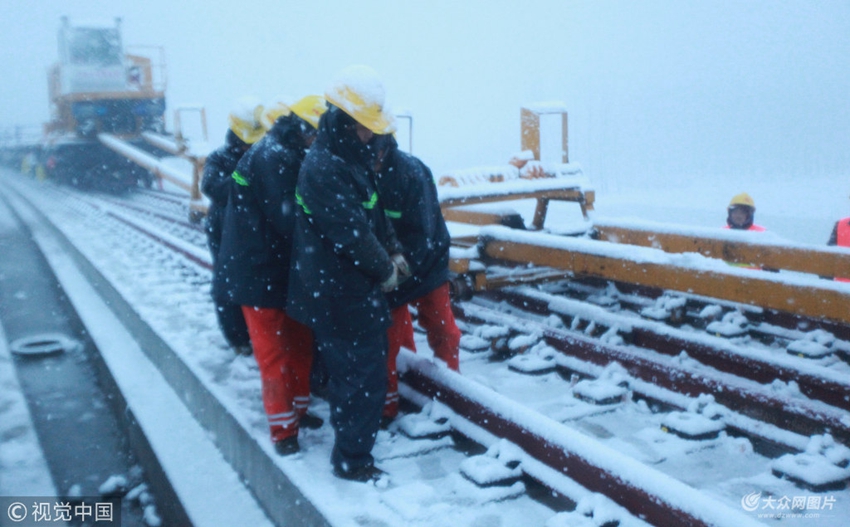 2018年12月5日,山東臨沂,在魯南高鐵臨沂市平邑段,中鐵十四局員工在風雪中作業。