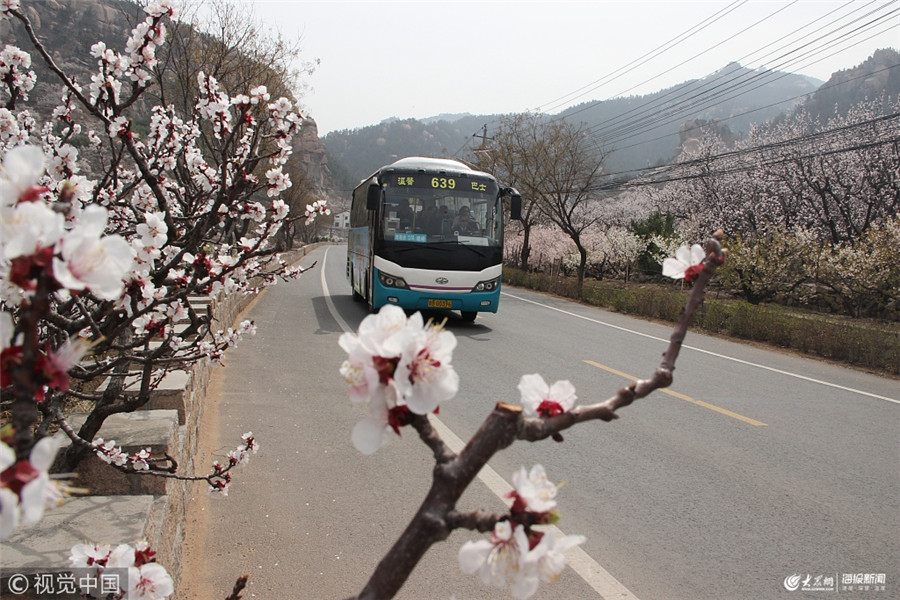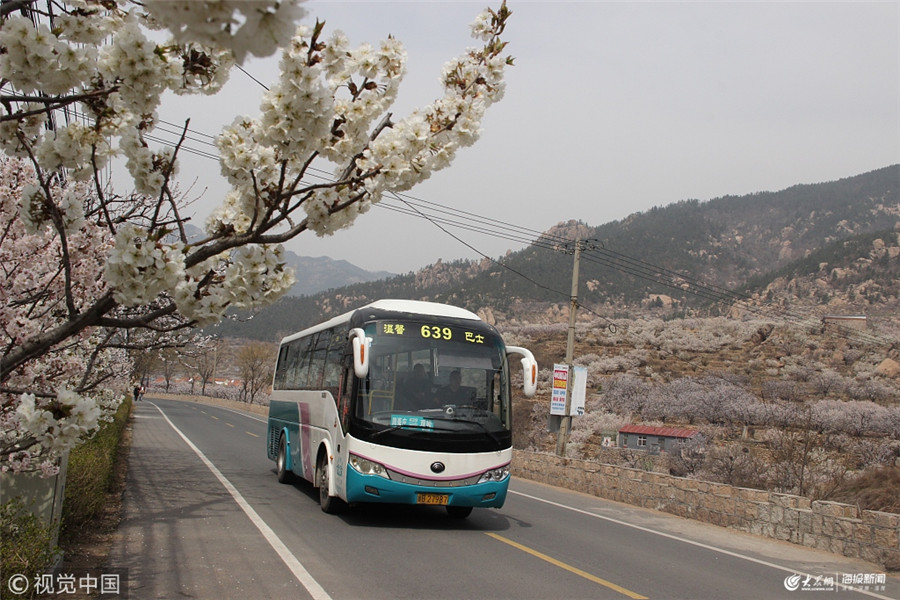 2019年3月29日,青島嶗山北宅櫻桃花陸續開放,一輛溫馨巴士正駛過我樂村櫻桃花海。
