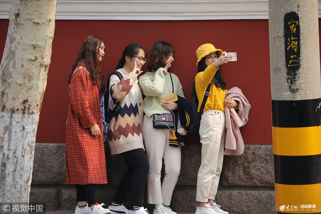2019年4月6日,年輕人在青島市南區大學路街區“打卡”游玩。