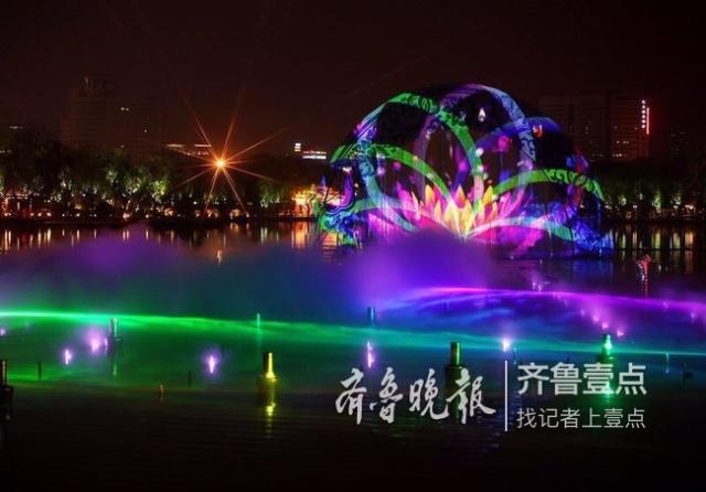 水幕呈現(xiàn)出濟南第三大名泉——珍珠泉,岸邊楊柳輕垂,泉水清澈如碧,一串串白色氣泡自池底冒出,仿佛飄灑萬顆珍珠,迷離動人。