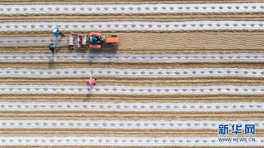 4月19日,在山東省高青縣常家鎮(zhèn),農(nóng)民在田間播種玉米(無(wú)人機(jī)拍攝)。 新華社發(fā)(張維堂 攝)