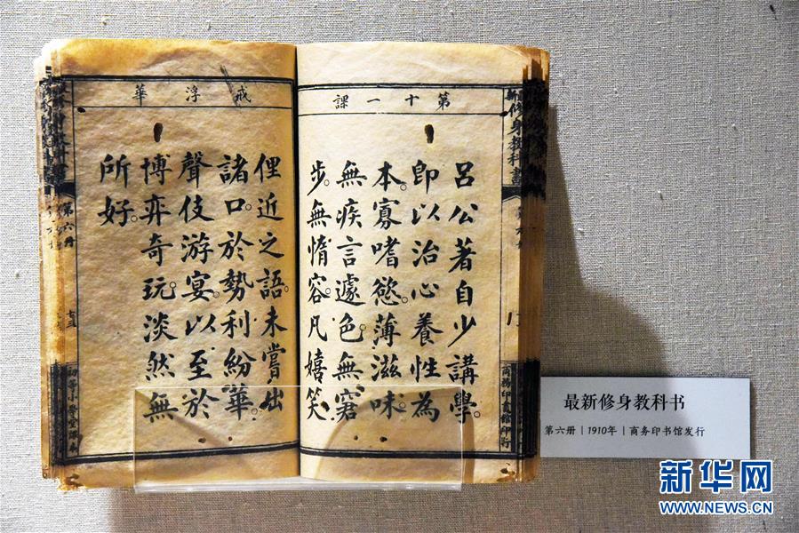 這是1910年商務(wù)印書館發(fā)行的《最新修身教科書》(4月21日攝)。位于山東淄博市高新區(qū)的課本博物館于2016年開(kāi)館,目前展出2萬(wàn)余件從清朝至今的課本原件,吸引眾多游客前去參觀。新華社記者 王凱 攝