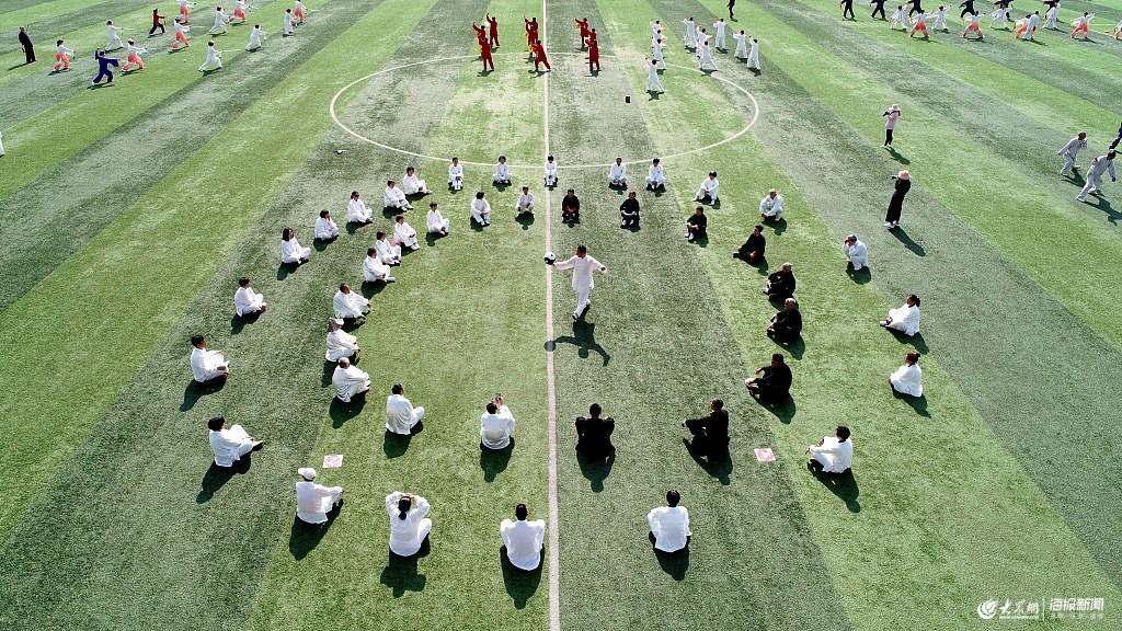 2019年5月9日,太極拳愛好者正在山東省臨沂市郯城縣體育場進(jìn)行表演(無人機(jī)拍攝)。