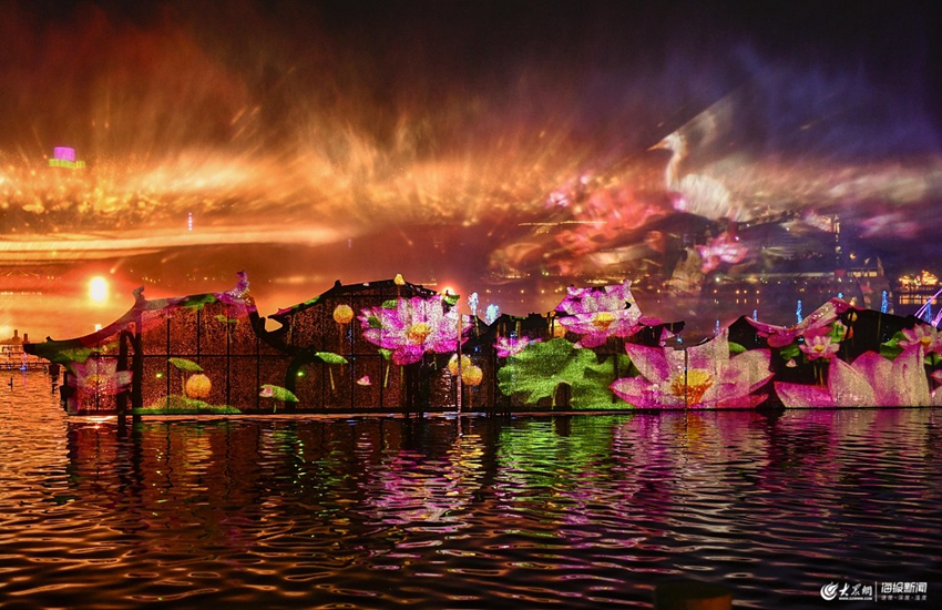 2019年5月10日晚,山東省濟南市大明湖景區“泉城夜宴·明湖秀”的演出現場。“泉城夜宴·明湖秀”是以泉城濃厚的歷史文化和秀麗的自然風光為創作源泉,深入挖掘濟南的泉水特色及人文元素,精心打造的一臺大型商演水上動態實景表演。它匯集噴泉、噴火、噴霧、矩陣光毯、表演大船、升降亭臺、投影機光等綜合演繹的“視聽體驗、綜合水秀”,為游客帶來一場美輪美奐、精彩紛呈的視覺盛宴。