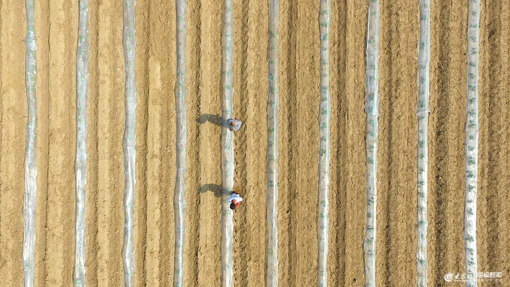 2019年5月19日,在山東聊城茌平縣肖莊鎮(zhèn)田莊村,農民在田間播種花生。(無人機拍攝)