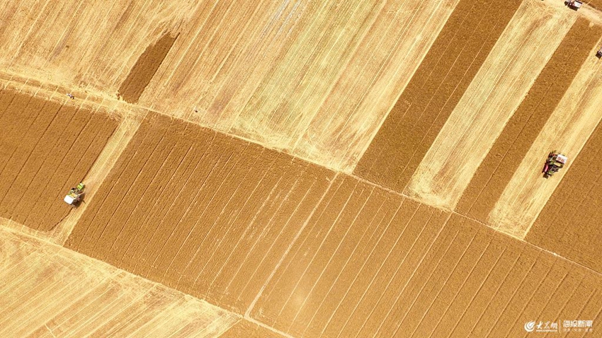 2019年6月9日,山東聊城,航拍聯合收割機在茌平縣賈寨鎮堤頭袁村田間收割小麥。