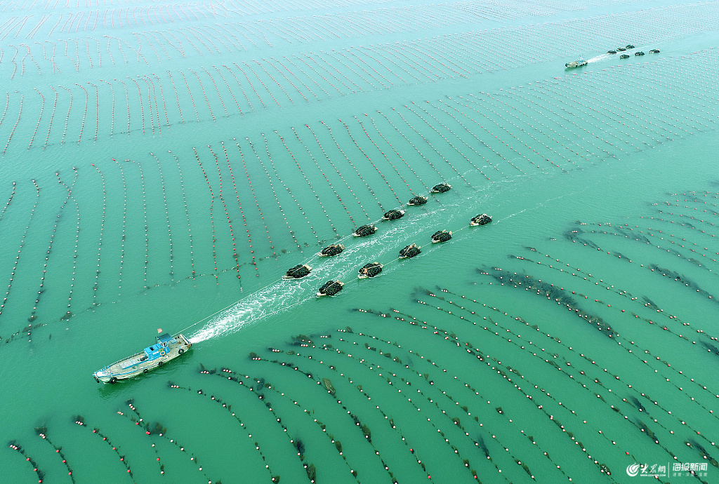 2019年6月16日,山東威海,榮成市桑溝灣海域,舢板滿(mǎn)載海帶駛向碼頭,一家沿海養(yǎng)殖碼頭,一派繁忙運(yùn)輸海帶的景象。