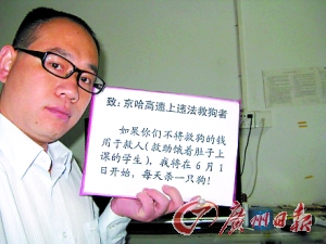 [提要] 上個月發生在京哈高速的“截車救狗”事件余波未平。一周前,有花都網友在微博上稱,如果救狗者不將救狗的錢捐助給貧困地區兒童,將從6月1日起每天殺一只狗,以示抗議。