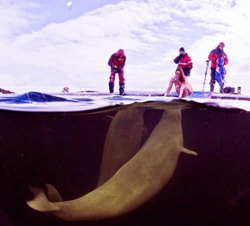 - 俄美女零度以下海水中全裸與白鯨嬉戲