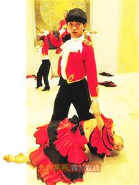 身后,10余對(duì)少年舞者身著同樣鮮紅禮服,身姿挺拔,妝容濃艷,表情冷峻,隨著一曲激昂的《西班牙斗牛曲》鏗鏘起舞。