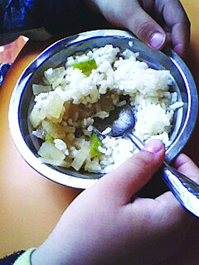 “這些食譜都是按照園里黑板公布的,實際寶寶吃的是什么?”網友“看似一片云”在帖中一口氣貼出60張照片,其中絕大多數都是關于孩子們在園中所吃午飯的照片,從什錦菜飯、各式湯到炒菜,種類較多。然而,飯菜“賣相”著實不堪入目。例如,孩子們喝的羅宋湯、青菜豆腐皮湯、紫菜蛋湯等都是清湯寡水的。孩子們的主食大多是一口飯加一口菜,盛在一個個小碗中。名為“筍瓜炒肉”,卻只見幾塊竹筍加一兩片青椒;名為“牛肉炒土豆”,圖中卻只有幾小塊土豆孤零零地呆在碗中。最讓人揪心的就是“八寶粥”。圖片中,一個電飯煲盛著菜湯和米飯,電飯煲一旁是裝著米飯的鋁盆,看上去污穢不堪。“看似一片云”注釋說,“這就是園里的八寶粥,是用中午的剩飯和剩菜一起再煮一次。”從曝光的照片中不難看出,孩子端著這樣的飯,難以下咽。記者隨后在網上留言,多次嘗試與“看似一片云”聯絡,但一直沒有回音。