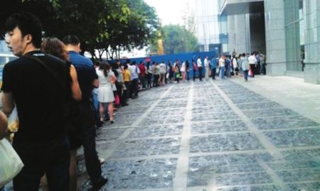 昨日上午9點,上班高峰。成都錦江區東方廣場C座寫字樓前,百余名白領在排隊等候乘電梯上班。隊伍從電梯間一直排到街上,約有50米長。