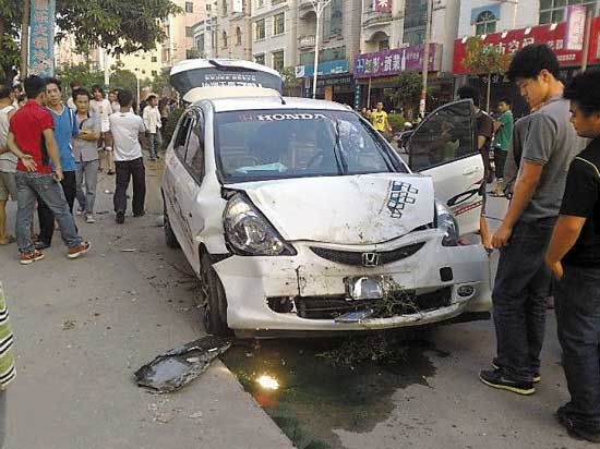 凌華坤的小車被撞擊后,失控沖上路邊的綠化帶,撞倒路樹(shù)再往前沖,撞到停在路邊的一輛四輪小面包車,之后又傷及一位60多歲的老人,沖行一段距離后才停了下來(lái)。
