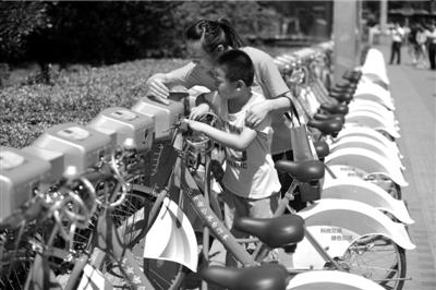 市民對新增設(shè)在地鐵旁的公共自行車服務(wù)系統(tǒng)十分感興趣。本報記者張斌攝