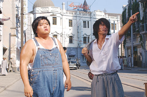 《天下無賊》打的是群星牌,“賊公”劉德華、“賊婆”劉若英、 “賊王”葛優、“賊女”李冰冰等,都是當紅影星。他們的造型較以 往都有了很大突破。劉德華同《龍鳳斗》中風度翩翩的“賊公”造型 完全不同,一身臟衣服,說著蹩腳普通話,全然一副流浪漢模樣,他 說從沒演過這么丑的角色,丑得讓自己一直無法接受。劉若英扮演的 “賊婆”角色也一改她過去的有些傻氣的形象,她對傻根呵護時的溫 柔,與“賊公”慪氣時的慍怒,表現得恰到好處。配角范偉、馮遠征、 傅彪、尤勇等的表演也都很出彩。 《功夫》靠的仍舊是周星馳的個人魅力。影片中有這么一段有趣 的鏡頭,面對豬籠城寨村民的反撲,周星馳扮演的阿星的幫手舉起手 中鐵籠“跟他們拼了”,但在舉起鐵籠的一刻,籠子門忽然打開,籠 中毒蛇一下就盤踞到阿星的臉上,給了他兩個結結實實的“毒吻”! 另外,阿星還被斧頭幫毒打,被四眼猴抓住頭發往板凳上撞……其悲 慘遭遇讓人同情不已。 值得一提的是,馮小剛在《功夫》中還客串了一把。他扮演鱷魚 幫老大,頂著滿口暴牙,瘸著腿,形象極其丑陋。影片一開始便是他 姘頭因隨地吐痰被抓進警察局,于是他帶齊人馬大鬧警署,探長無奈 搬來斧頭幫出頭,一場大戰之后鱷魚幫全軍覆沒。不知背后戰況的馮 小剛還大叫一聲:“還有誰?”然后跟斧頭幫大佬叫囂道:“讓你看 看鱷魚幫幫主的厲害!”結果卻被斧頭幫大佬一拳打翻在地。雖然只 有短短幾分鐘的鏡頭,馮小剛的表演倒也不乏可圈可點之處。