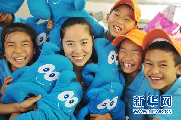 貴州畢節黔西縣素樸小學支教老師蔡加芹(左二)和孩子們一起高舉“海寶”,回憶在上海世博會旅游期間的經歷(8月6日攝)。貴州省黔西縣素樸小學支教老師蔡加芹有個樸素的夢想。支教一年,臨別之際,要為那些“半塊洋芋就能高興一下午”的娃娃們再做些什么。娃娃們也有一個夢想,想看看山外的世界是什么樣。一年來,娃娃們總纏著這位“外面來的”蔡老師問這問那,聽她說“外面”的千姿百態、豐富多彩。一根網線,一條網貼,幾十個網友,讓蔡老師和娃娃們踏上了跨越五省六市、行程數千公里的“不可能的旅程”。 新華社記者歐東衢攝