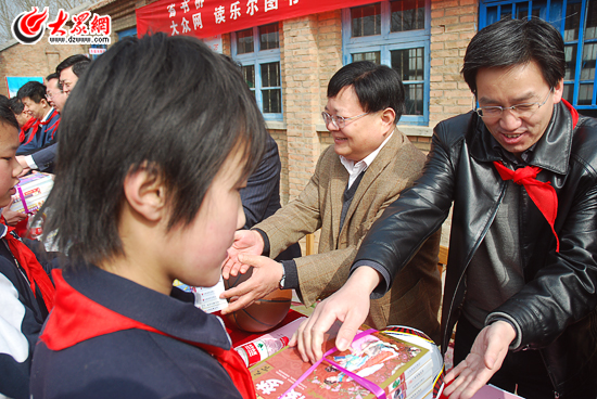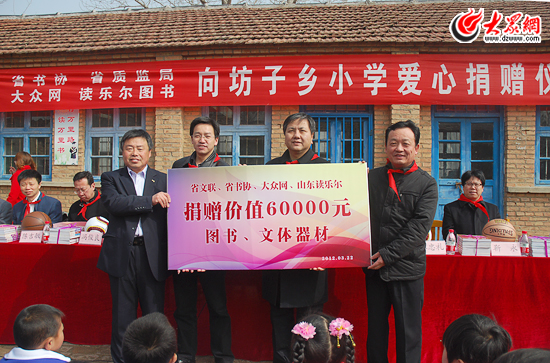 今天上午,山東省書協、山東省質監局、大眾網、山東讀樂爾圖書有限公司在德州市平原縣坊子鄉紅廟小學舉行捐贈儀式,共捐贈了價值10萬余元的愛心圖書和文體器材。山東省文聯副主席、山東省書法家協會主席顧亞龍,山東省質監局黨組成員、紀檢書記姜文俠,山東省網絡文化辦公室副主任馮俊良,大眾網董事長、總經理林忠禮,山東讀樂爾文化傳媒公司董事長孫衍奎等出席捐贈儀式。