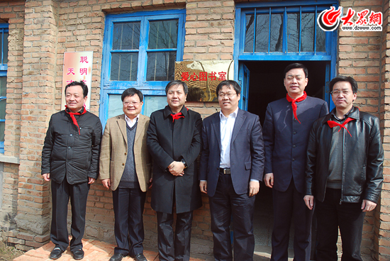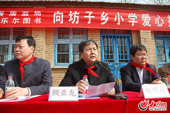 學生代表向與會領導敬獻紅領巾,并向省書協、省質監局、大眾網和讀樂爾公司贈送錦旗。省書法家協會主席顧亞龍,省質監局黨組成員、紀檢書記姜文俠,省網絡文化辦公室副主任馮俊良,大眾網董事長、總經理林忠禮,山東讀樂爾文化傳媒公司董事長孫衍奎,平原縣委副書記趙明國共同為坊子鄉小學“愛心圖書室”揭牌。