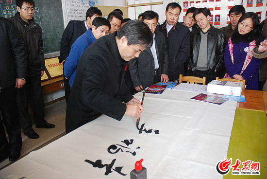 捐贈儀式結束后,山東省書法家協會主席顧亞龍在坊子鄉中心小學為學生和書法教師上了一堂書法課。顧主席向同學們講解了中國書法發展的歷史,以及書法文化傳承和人格修養的意義。他說,書法不僅僅是寫字,書法傳承了中華民族文化,承載了道德價值觀;在傳統文化中,寫字與做人是緊密相連的,書法中包含著做人的道理。顧主席向同學們提出了殷切的希望:“熱切地希望坊子鄉小學的同學們,從小寫好中國字,長大做好中國人,通過書法體驗文化,通過筆墨提升人格,成長為德、智、體、美、勞全面發展的好公民!”