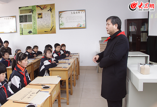 山東省文聯副主席、山東省書法家協會主席顧亞龍在坊子鄉中心小學為學生講授書法課。大眾網記者 王長坤 攝