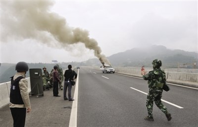 一名武警手持滅火器走向冒煙的奔馳車。警方朝劫持案事發車里施放了催淚瓦斯。蒼溪縣公安局供圖