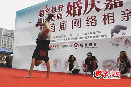 15日,隨著大眾網總編輯朱德泉宣布“招商銀行山東省首屆婚慶嘉年華暨首屆網絡相親大會活動”正式開始,為期兩天的婚慶盛宴和相親大會在濟南泉城廣場拉開序幕。模特婚紗展示、勁爆街舞陸續呈現給市民。