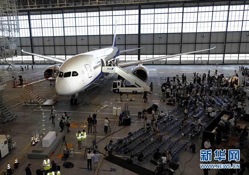 7月4日,在日本東京羽田機場,全日本航空公司(ANA)的一架“夢幻客機”波音787停在機庫中。這架世界上目前最先進的客機于7月3日清晨降落日本,完成了首次飛越太平洋的測試飛行。 新華社/法新