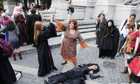 一個自稱“普京軍團”的組織,最近在vkontakte.ru/armiaputina網站上公布了一段視頻:一名自稱戴安娜的金發美女學生,穿高跟鞋和黑色套裝行走在莫斯科街頭,隨后,屏幕上出現紅色口紅寫下的口號“為了普京,我將撕開我的衣服”,這名女學生同時也開始脫下她的衣服。據稱,那些受邀“為普京脫衣”的女孩,將有機會贏得iPad2。