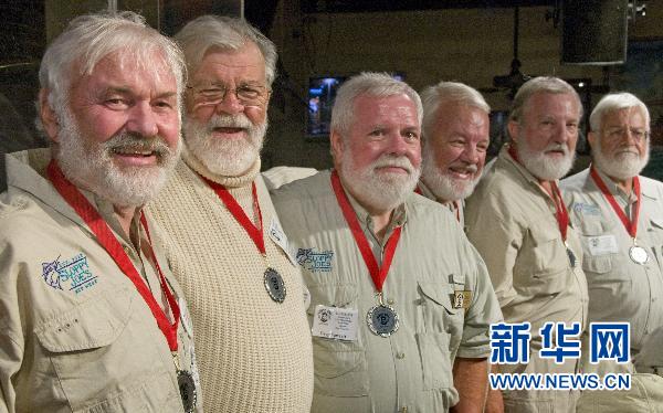 7月21日,海明威模仿大賽的參賽者在美國佛羅里達州海島小城基韋斯特的“邋遢喬”酒吧合影。