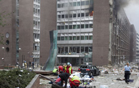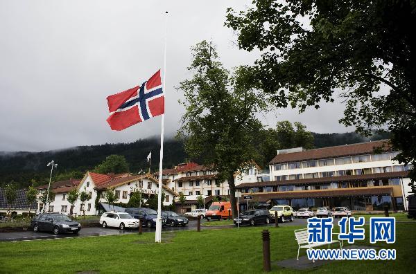 7月24日,在挪威首都奧斯陸襲擊事件幸存者聚集的酒店外,挪威國旗降至一半,向死難者致哀。當日,許多國家民眾自發舉行活動,悼念挪威爆炸和槍擊事件中的遇難者。 新華社/法新
