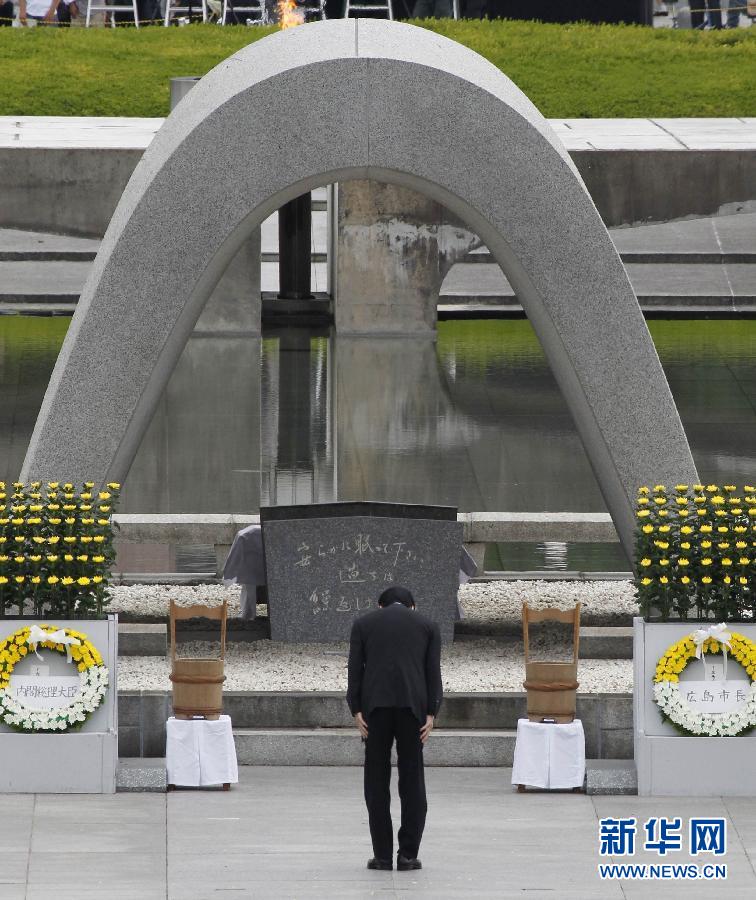8月6日,在日本廣島市中心的和平公園,日本首相菅直人向原子彈爆炸遇難者紀(jì)念碑鞠躬致意。
