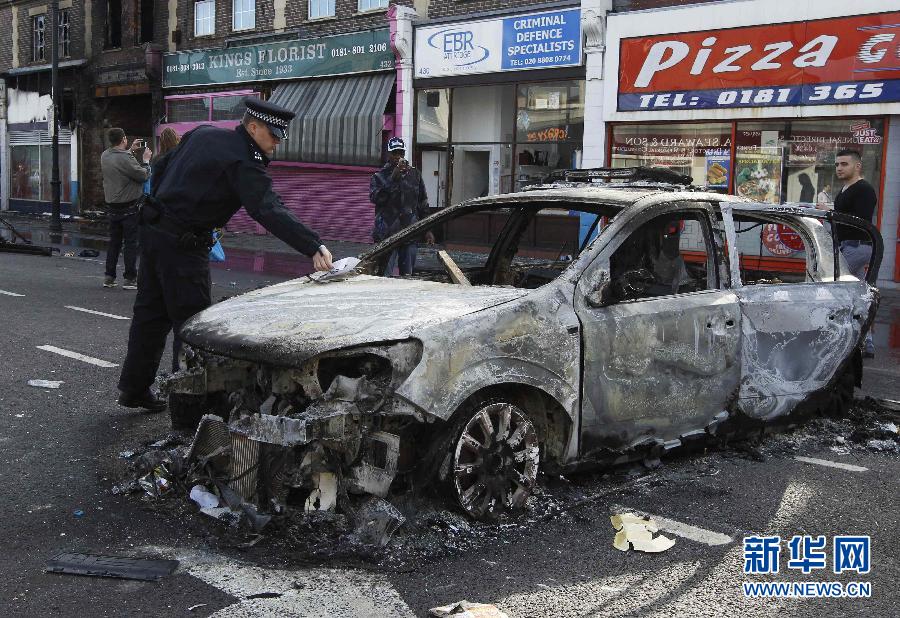 8月7日,在英國倫敦城北托特納姆區(qū),一名警察取下警車上的鑒定證明。這輛警車在8月6日晚的騷亂中被放火燒毀。英國倫敦警察局7日說,倫敦一夜騷亂之后,8名警察因傷入院治療。新華社/路透