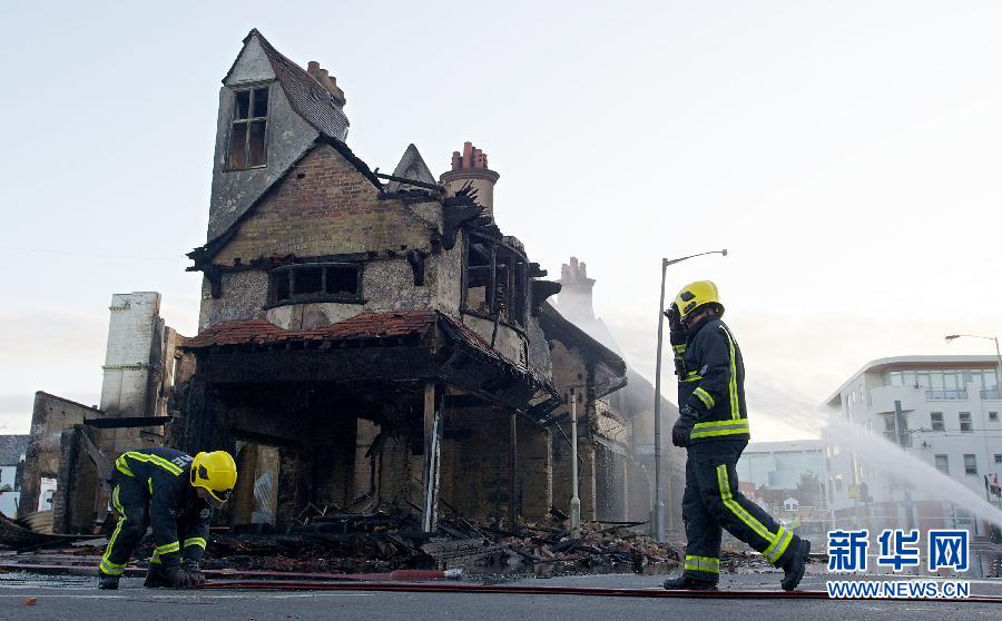 8月9日,在倫敦南部的克羅伊登,消防員向被燒毀的里夫斯家具店噴水。倫敦8日晚再次發生騷亂,這已是連續第3個不平靜的夜晚。騷亂不僅在倫敦市內多個地區蔓延,而且向伯明翰和利物浦等城市擴散。正在意大利休假的英國首相卡梅倫為此于8日夜趕回倫敦。新華社/法新