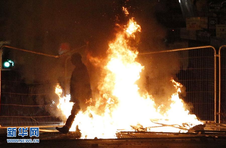8月9日,在英國利物浦,一名鬧事者走過一個著火的路障。